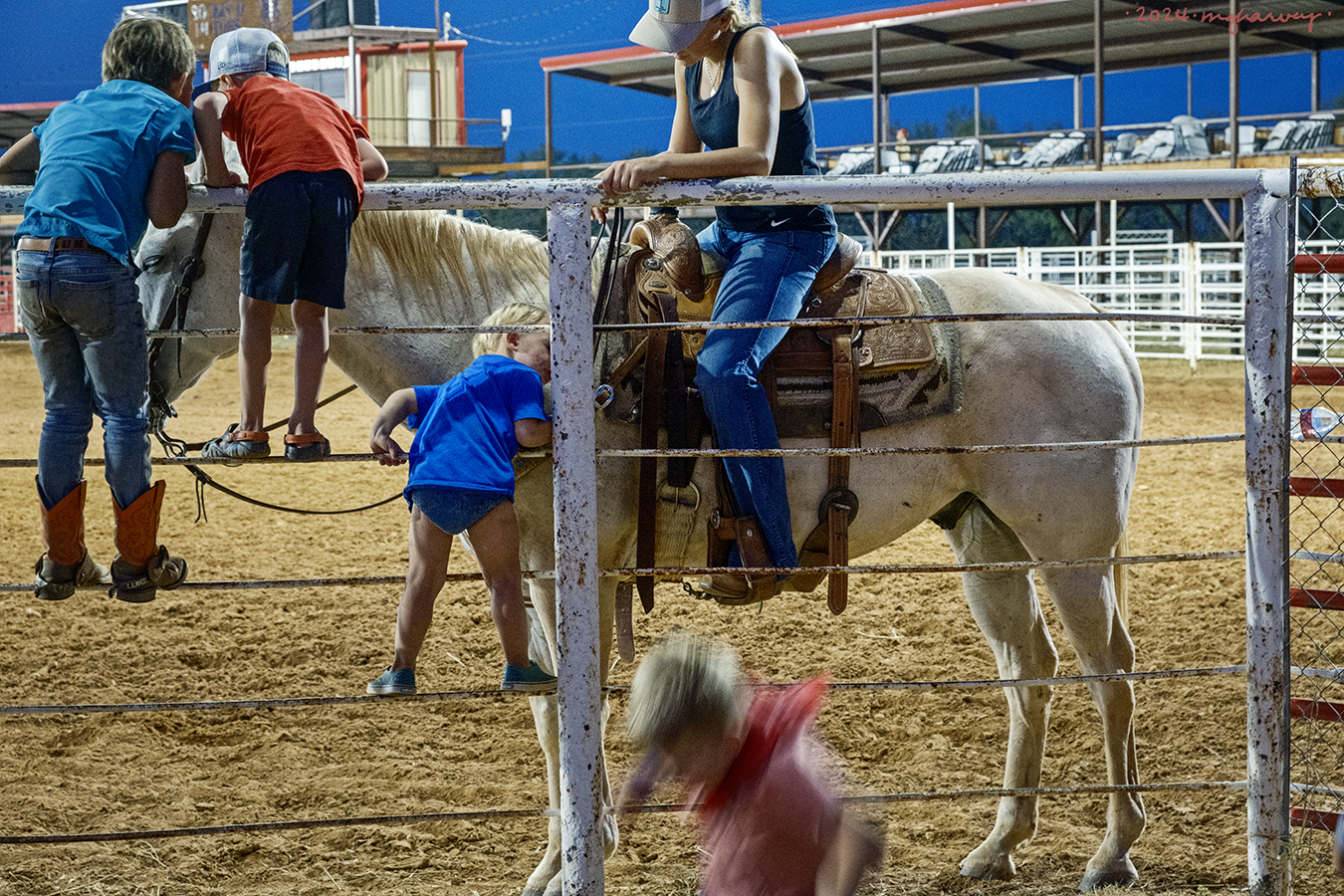 If you ever wondered if ranch kids were scrappier than town kids, I can assure they are. These little kids were all over the place, throwing dirt at each other, engaging in ad hoc tug of war games, clonking their heads on pipe-rail fences, and climbing up to get a close look at a horse. And enjoying every minute.