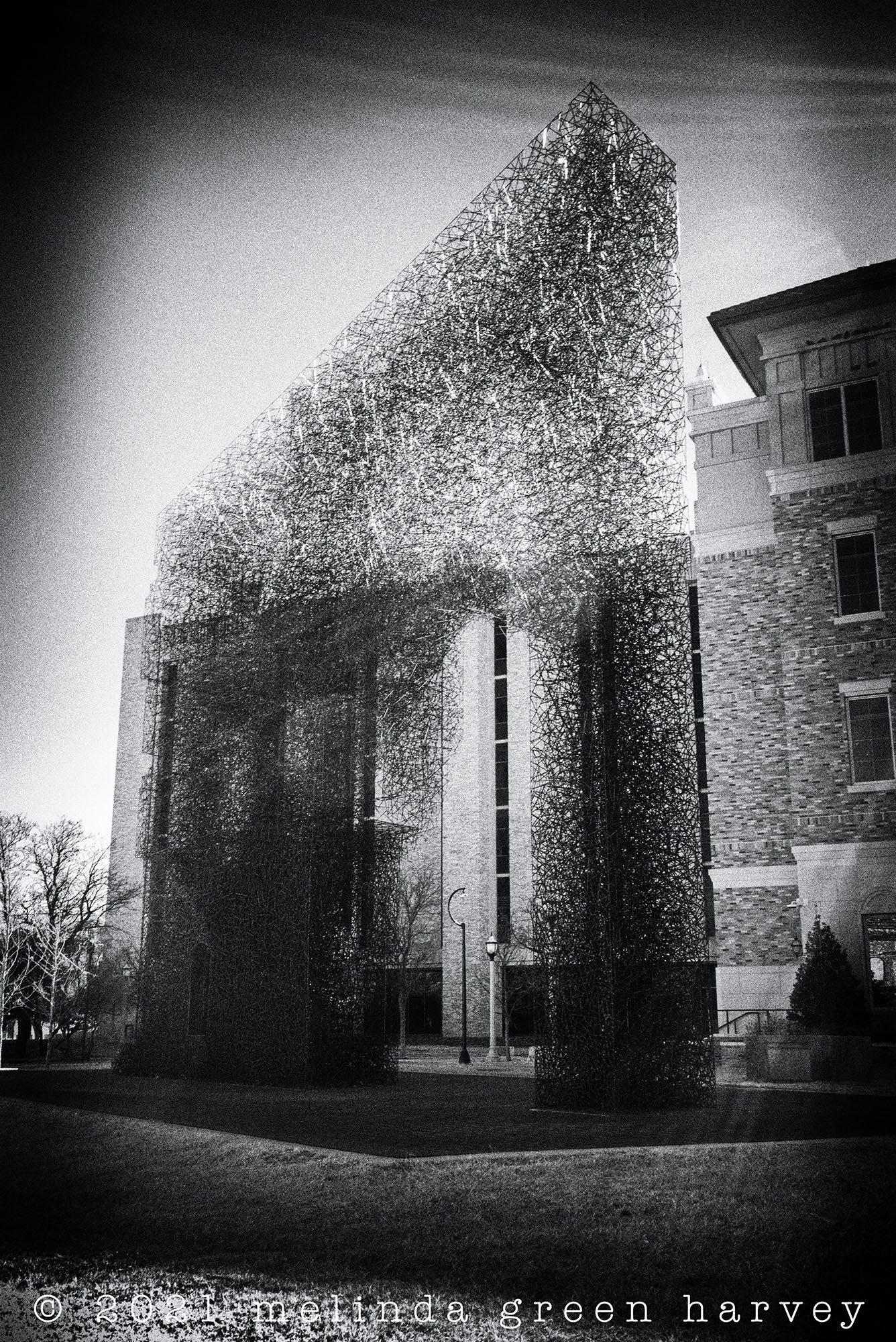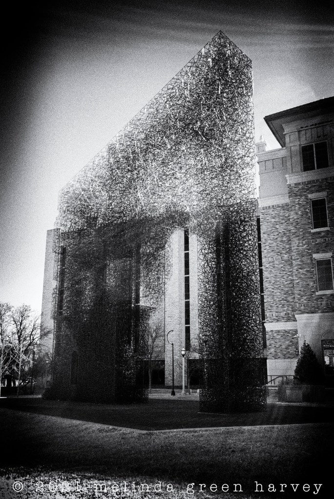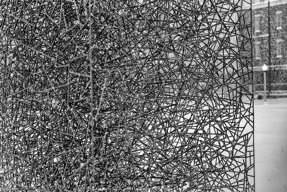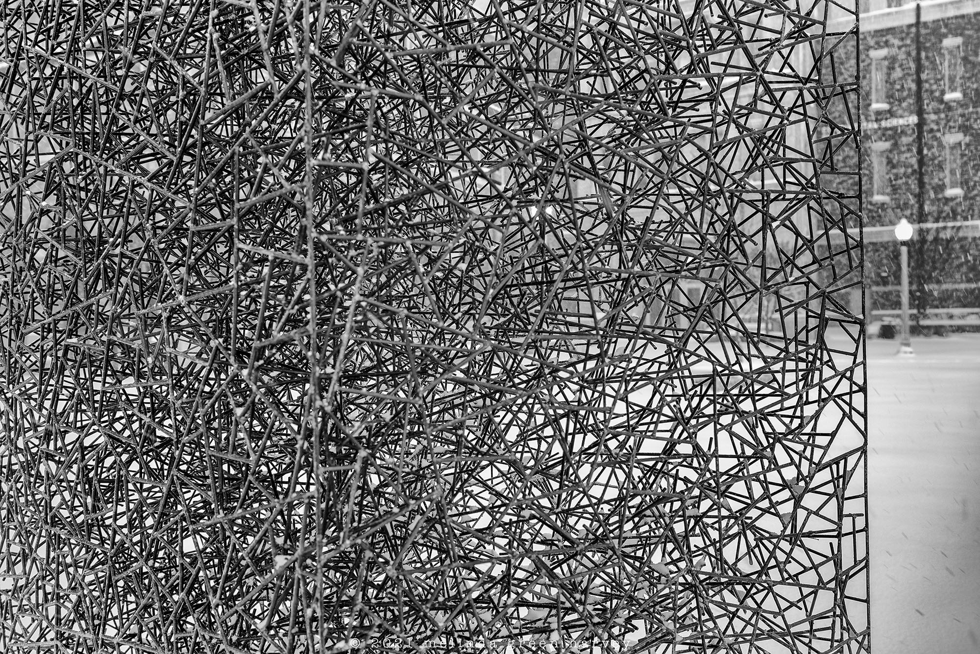 This piece, which was installed in 2019, is one of my favorites, because it looks like a pencil sketch come to life. It’s called “Oblique Intersection” and is made of short stainless steel rods welded together. The shapes in the piece mirror the architectural shapes of the campus buildings. From certain angles and even though it is a huge piece, it almost disappears. It looks different depending on the sunlight’s angles. It looks different at night. It looks different in the snow (come back on January 25 to see that.). It is, in short, a delight to view, no matter when you look at it. Here’s an article (that has an imbedded video) about it.