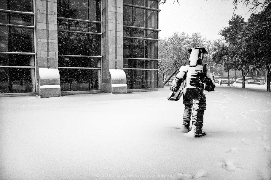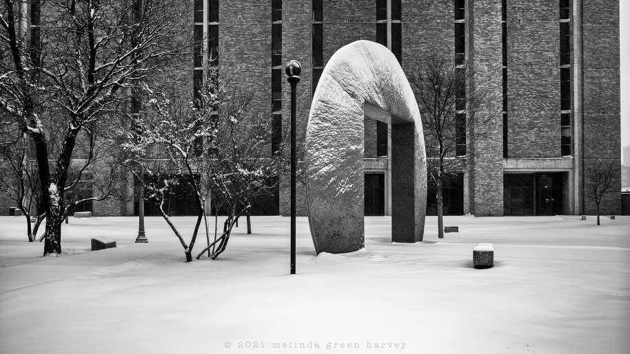 This piece, Square Spiral Arch, is by Jesús Moroles. It features spiraling lines of texture – which are enhanced by the snow clinging to them – to represent fingers of energy. The circle and square motif represents heaven and earth and are reflective of the artist’s work and travels in Asia. (from Texas Tech’s public art app, ArTTech.)