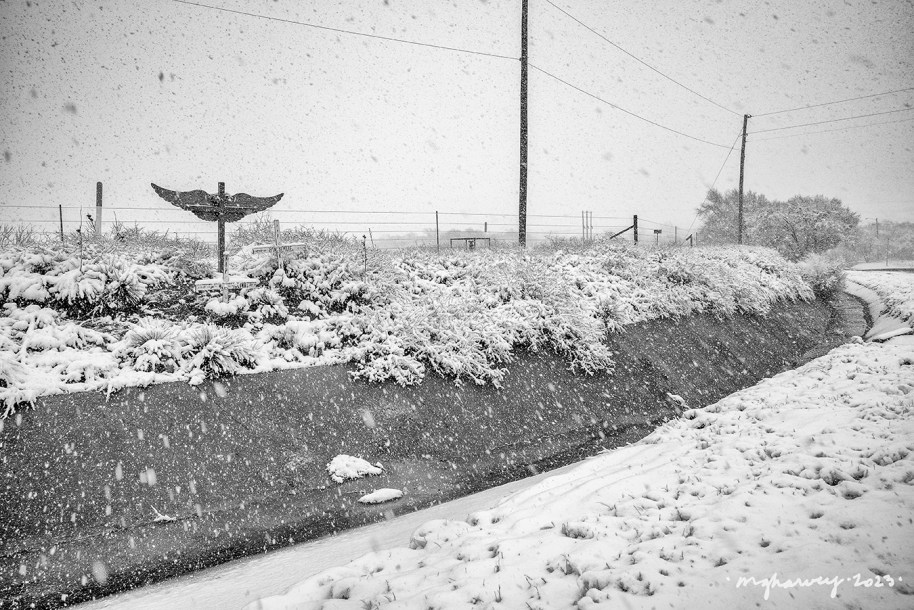 I’ve photographed this roadside memorial before, but not with heavy snow falling on the crosses which commemorate the deaths of two people. I’m not used to snow or to photographing it (after all, I do live in Texas) but the symbolism of it – of life and death, of purification, of transformation – has not escaped my attention. And it did not escape my camera.