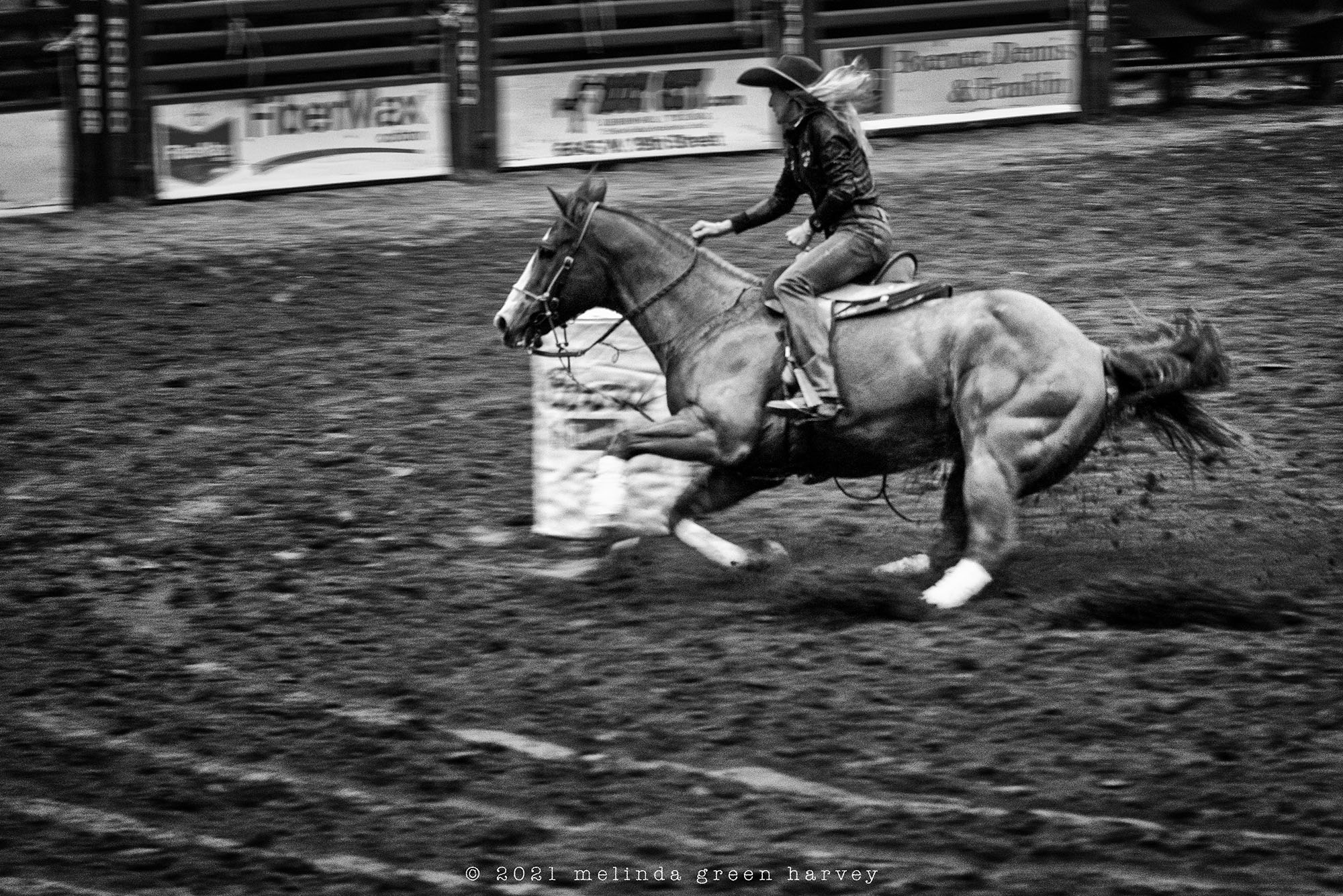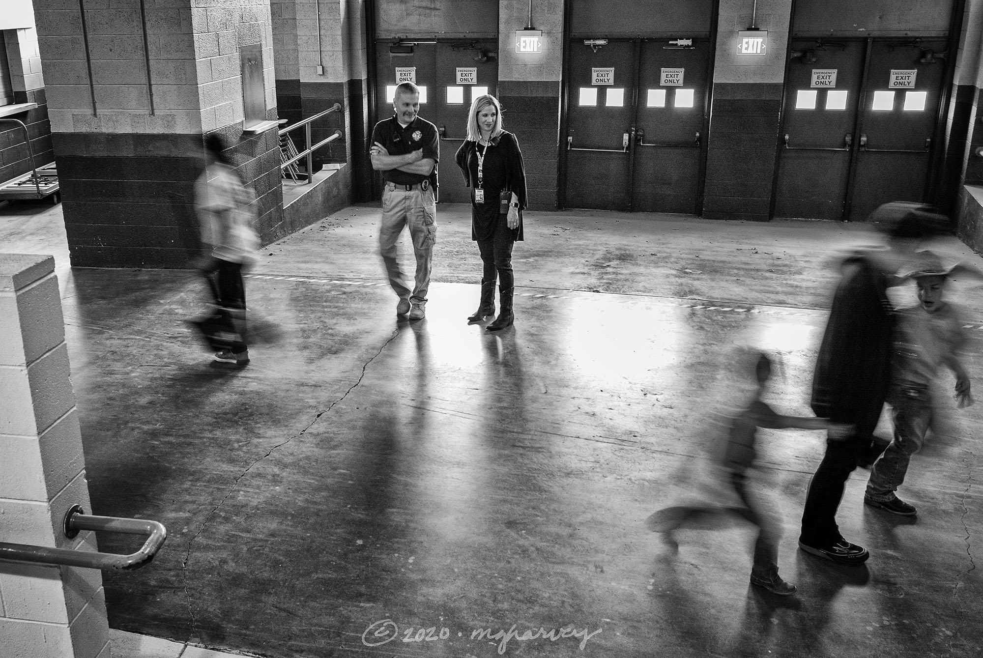 If you’ve spent more than five minutes looking at my photographs, you already know I almost never photograph people. But sometimes, I can tell that it’s time to break my own rule. Like this one right here, with those two official-looking people watching that trio hurrying toward one of the last rodeos that would ever happen in this particular building.