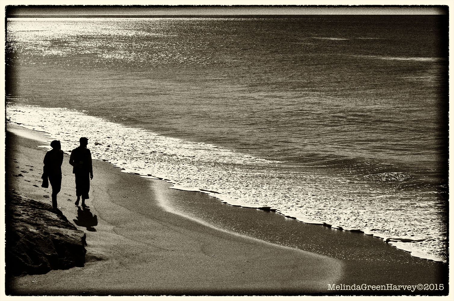A couple strolling along the beach cast a single shadow – because of the rock, not because they were that close together.