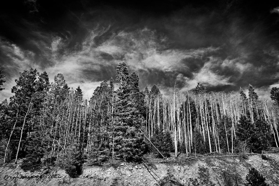 I fully realize that I am not breaking any photographic ground or anything with this image – it’s what I put in the category of “any reasonable person with a camera could do this shot.” But I like it anyway: it’s a view I don’t get on the plains, the aspens hasn’t leafed out yet, and the clouds were making a good showing of cloud-ness.