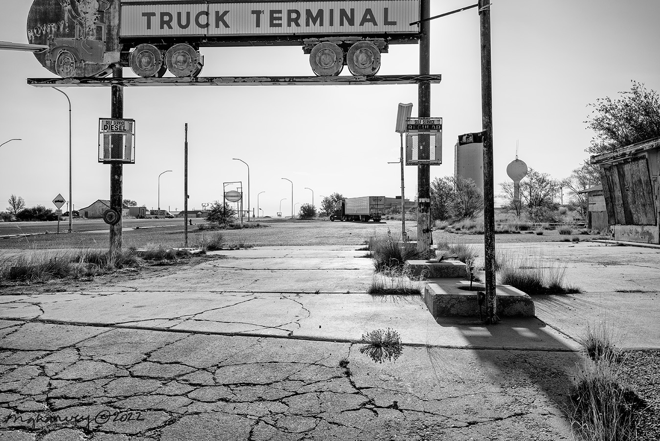 My second favorite part of the image are the handprints on the dusty booth. And my favorite part is the little Route 66 sign, hidden away on the back wall.