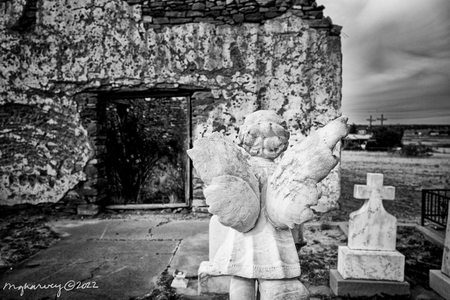 I can’t go to Santa Rosa without stopping at this old cemetery, with its roofless, falling down church ruins. I like the way a now-gone bush scratched wind-driven arcs into the wall. I like the way the a little more of the stucco has let go of the adobe walls every time I go by. But mostly I like the broken-winged angel, who is watching the slow-motion collapse of the building.