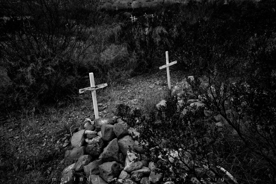 But the cemetery is sizable. It’s also rugged, with cactus and mesquite trees alongside rocked-topped graves. Most of the graves are marked with simple wooden crosses, none of which have any identifying information on them. And, oddly, in a town with almost no inhabitants, the paint on most of the crosses appears to be fairly new. But someone paints them…