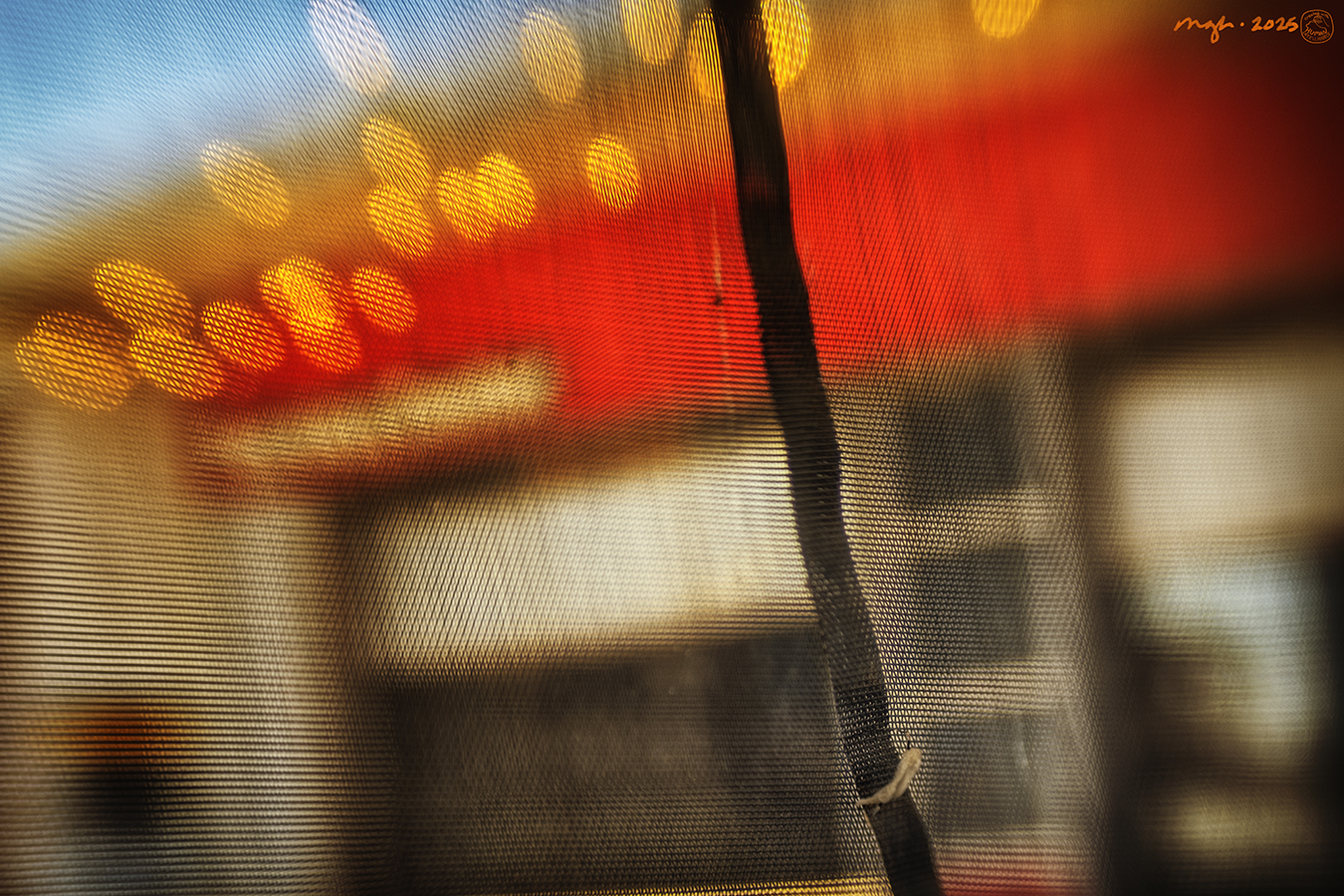 It’s housed in an old gas station and there’s an outdoor dining area, marked by black net, where the fuel pumps used to be. This is a shot of the netting that slows down the wind*, provides a bit of shade, and snags up cotton lint from the gin across the road.