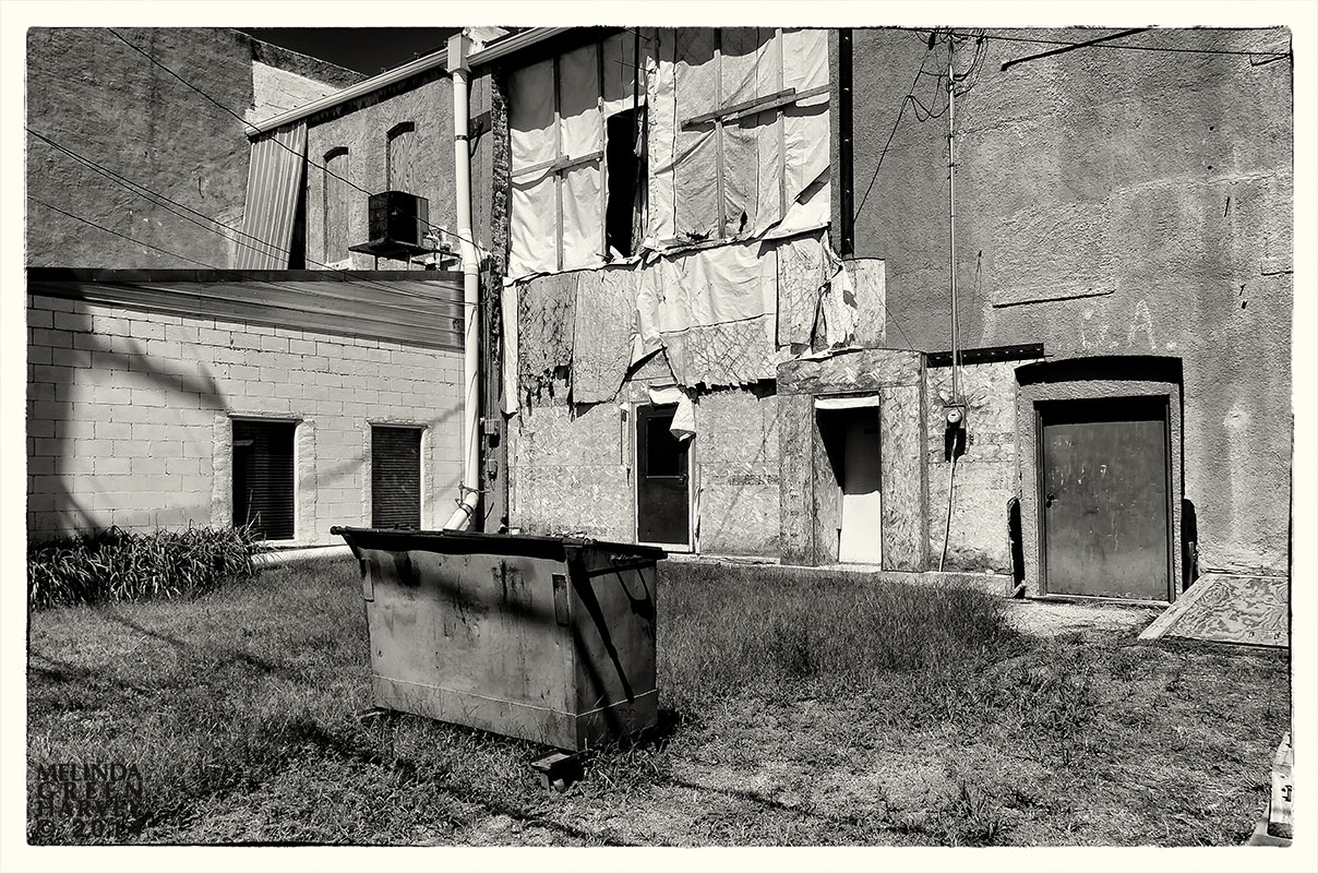 And, while that was interesting, as you know, I like to check out the backs of things. Otherwise, I would have missed the sad state of things in the alley, with that dumpster that left me wondering how the garbage truck got to it, the plastic sheets that’ve been hanging on the wall for so long they looked like tattered draperies, and the G.A., which might have stood for Go Away.