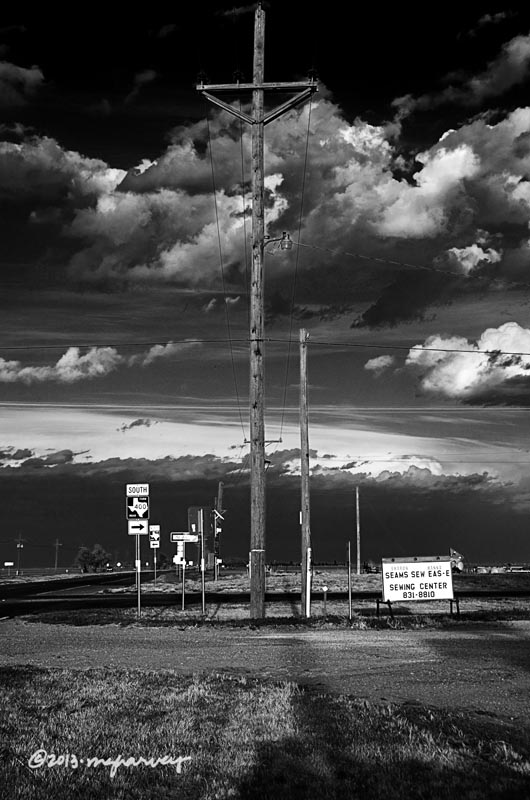 I was driving home from a meeting; there were clouds on the western horizon that gave a gold tint to the light. In the east and north were remnants of a storm that had had a tornado in it. It was a nice change to see so many clouds; the on-going drought has meant a lot fewer spring storms than usual.