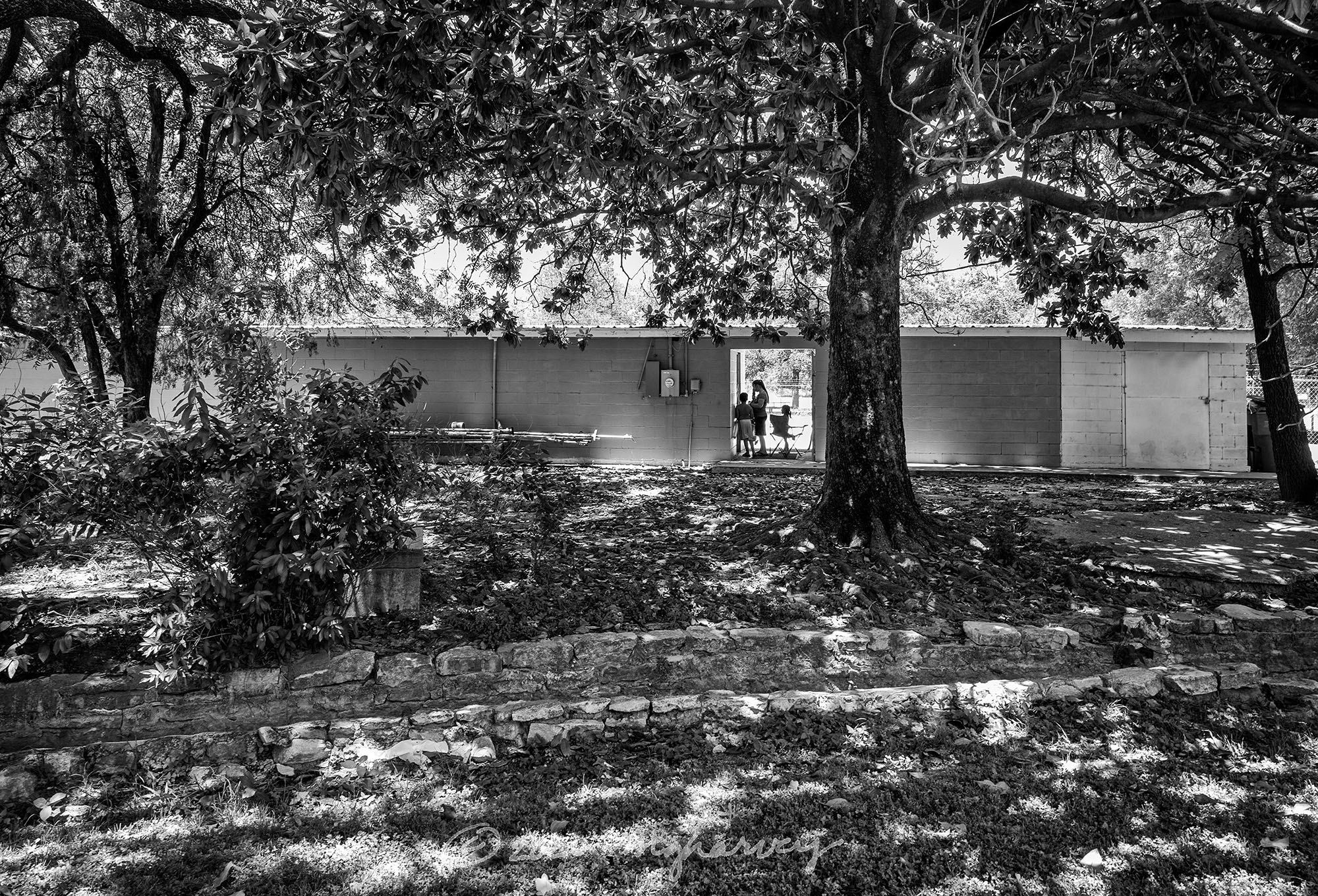 It was a hot and dry day. The town’s swimming pool was open; from a block away I could hear those shrieks that are particular to kids playing in a pool. It seemed so summery and normal which made me think about going in to take pictures of the swimmers. (I know! I thought about photographing people. Must have been a bit of a heat stroke.) I didn’t go in, though, because that seemed creepy and intrusive, and because this woman and her family created a nice enough tableau as they paused to pay their admission fee that I didn’t need to go any further.