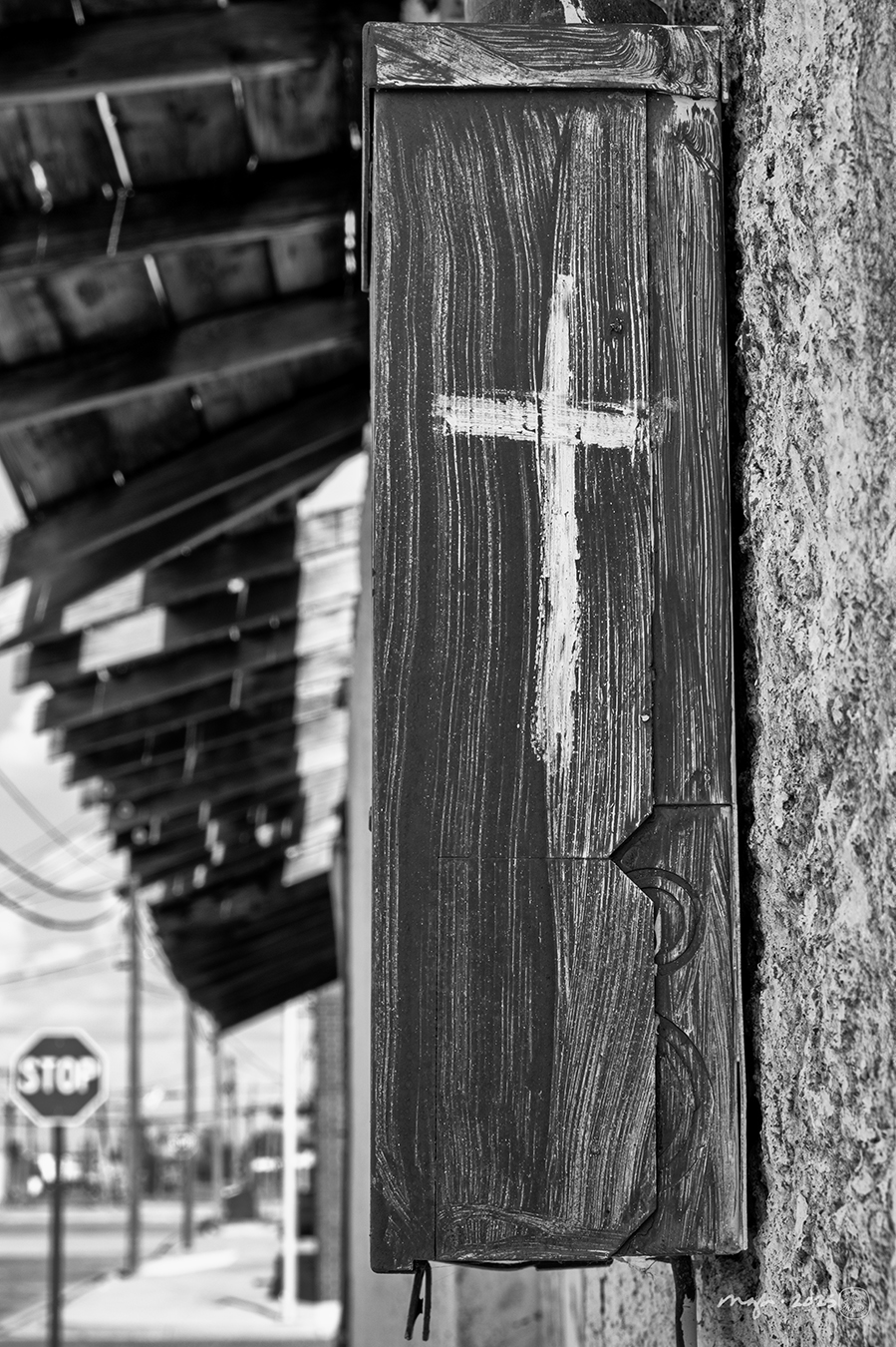 When I come home with new photos to edit, one of my regular tools – in addition to Lightroom and Photoshop – is Google street view. I can get the exact street name, for example, or what a particular business is called instead of whatever name my name gave it (“junky hair salon” is very rarely the actual business name, for example). But anyway, that’s how I know for sure that the cross painted on this utility box has been there since at least May 2023.