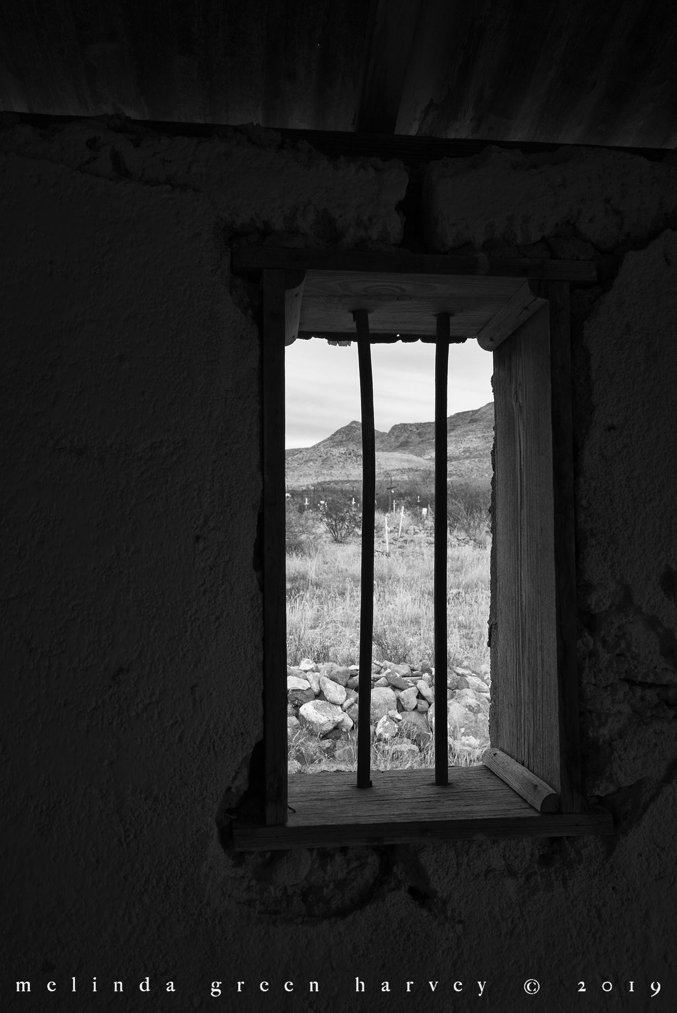 View from inside a cemetery shrine, constrained by the bars on the glass-free window.